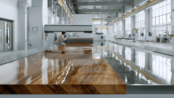 Затем после полимеризации в термовакуумной камере при высокой температуре на всю глубину (30–50 мк) в него внедряется рисунок, повторяющий фактуру дерева или камня.
